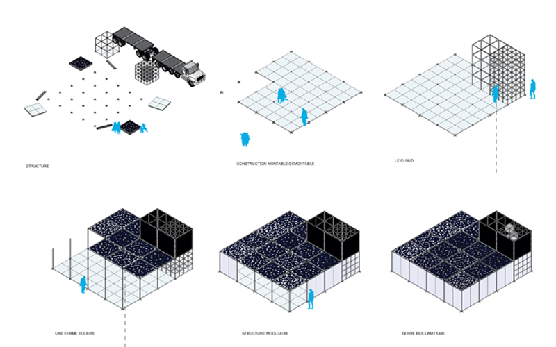 Sa conception qui lui permet de s’installer en pied d’immeuble sur les espaces disponibles des grands ensembles sans dépôt d’autorisation d’urbanisme pour une durée particulière. Constitué d’éléments préfabriqués (ossature acier, dalles de sol préfa, mobilier modulaire), il peut être aisément installé en quelques jours sur site.