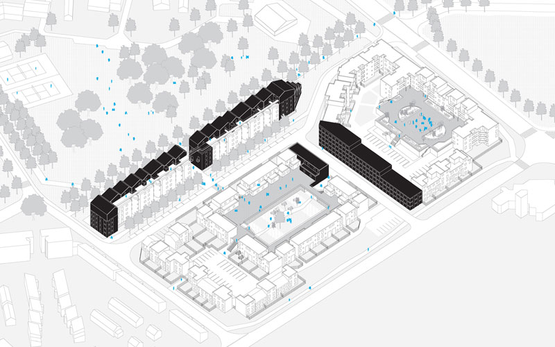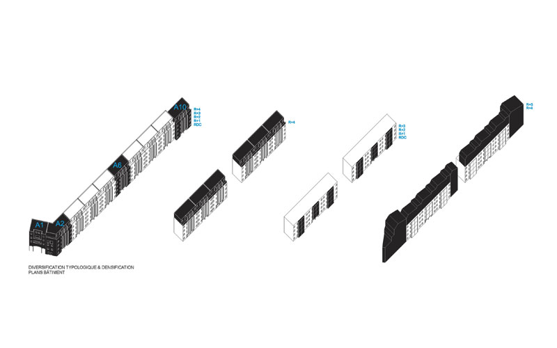 Une forme urbaine introvertie fermée comme la cité de Carcassonne qu’il faut rouvrir. Un parc sur lequel une longue barre doit s’installer. Remodeler, transformer plutôt que détruire cet ouvrage. Densifier ici pour libérer là-bas