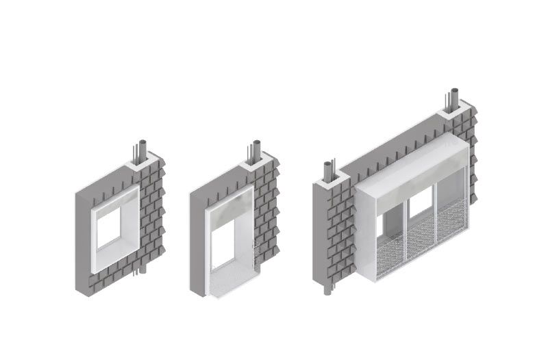 Réflexion sur la cellule. La première opération consiste en la dépose de la façade existante et son remplacement par une nouvelle façade épaisse, porteuse, incluant des gaines techniques. Elle offre un nouveau clos-couvert sur des standards thermiques élevés.