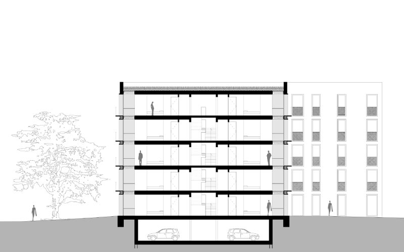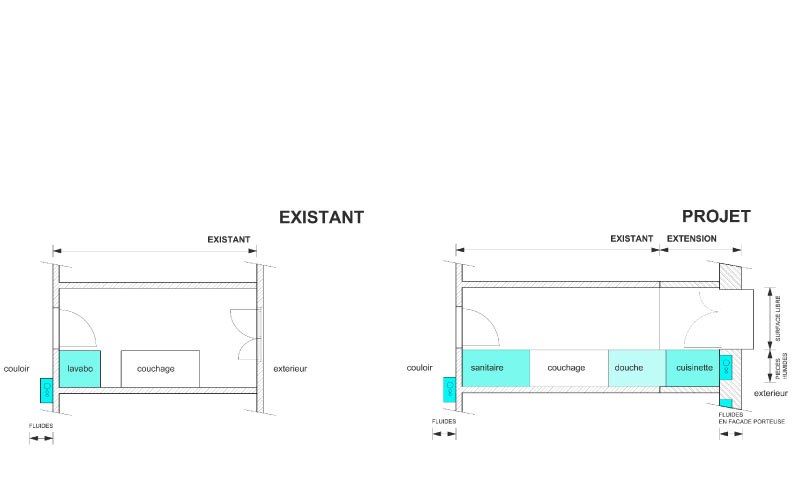 Les plots 1 et 2 abriteront des logements étudiants. Un type de cellule double est développé. Le plot 3 abritera un foyer avec des logements à faible surface. Deux ascenseurs seront installés. L’un desservant les plots 1 & 2 et l’autre le plot 3 Les équipements au cœur du volume sont repensés. Des trémies sont ouvertes pour créer des puits de lumière éclairant les communs et permettant une ventilation naturelle.