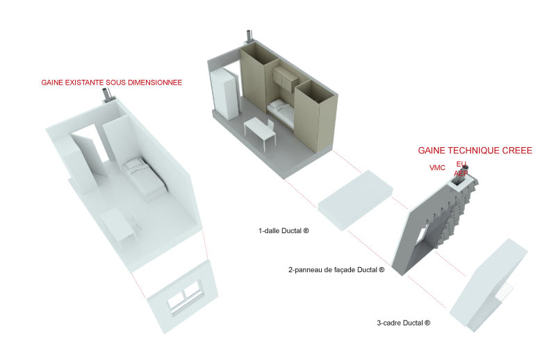 Cette façade en BFUP est porteuse et permet l’adjonction d’1,20 de nouveau plancher. Un gain de surface nécessaire au standard minimum de confort d’une chambre étudiante. Les fluides en façade permettent l’installation d’une cuisinette, d’une douche PMR et d’un WC. Le panneau profond (55 cm) comprend une grande baie toute hauteur et un balcon par cellule.